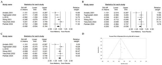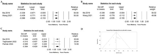 Mulberry extract supplementation was associated with a small reduction in AST (Figure 7A; overall random effect: −0.306, 95% CI: −0.6060 to −0.006; I2 < 0.001%, p = 0.150), while ALT showed no significant change (Figure 7B; overall random effect: −0.136, 95% CI: −0.434 to 0.163; I2 < 0.001%, p = 0.423). These findings suggest a possible hepatic benefit, particularly for AST. In contrast, there was no significant effect on blood pressure: systolic blood pressure (Figure 7C; overall random effect: −0.436, 95% CI: −1.070 to 0.199; I2 = 47.340%, p = 0.150) and diastolic blood pressure (Figure 7D; overall random effect: −0.662, 95% CI: −1.559 to 0.235; I2 = 71.843%, p = 0.029).
