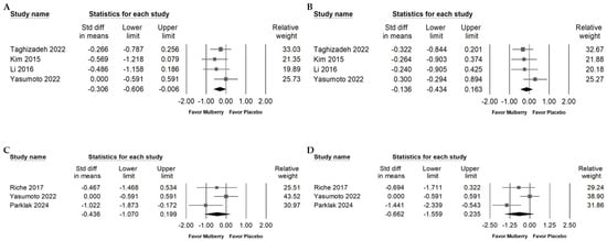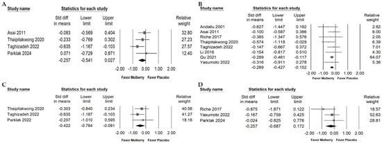 The effects of mulberry extract on glycemic markers were evaluated across several endpoints. A slight reduction in fasting insulin was observed, but this change was not statistically significant (Figure 6A; random effects model: −0.257, 95% CI: −0.541 to 0.027; I2 = 2.655%, p = 0.379). In contrast, a small but significant decrease in HbA1c was detected, suggesting possible improvements in long-term glucose regulation (Figure 6B; random effects model: −0.289, 95% CI: −0.427 to −0.152; I2 < 0.001%, p = 0.905). Mulberry extract also led to a slight reduction in insulin resistance as indicated by HOMA IR (Figure 6C; random effects model: −0.442, 95% CI: −0.764 to −0.081; I2 < 0.001%, p = 0.583). No significant change was found in body weight (Figure 6D; random effects model: −0.257, 95% CI: −0.608 to 0.172; I2 < 0.001%, p = 0.389). Overall, these findings suggest that mulberry extract may support improvements in long-term glycemic control, while effects on fasting insulin and other metabolic outcomes remain uncertain and warrant further investigation.