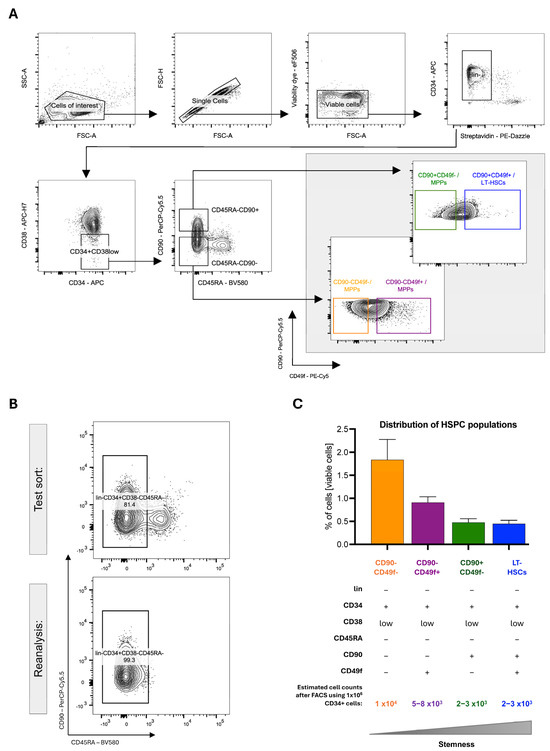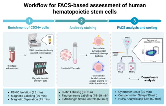 Schematic overview of the experimental workflow used in this protocol. Mononuclear cells were isolated from mobilized leukapheresis products via density gradient centrifugation. CD34+ cells were enriched using magnetic-activated cell sorting (MACS), followed by fluorescence-activated cell sorting (FACS). Cells were stained with biotin-labeled antibodies for lineage depletion and fluorochrome-conjugated antibodies for hierarchical gating. Distinct marker combinations were used to isolate hematopoietic stem cells (HSCs) and multipotent cells (MPPs) from hematopoietic stem and progenitor cells (HSPCs) for downstream analysis. This figure was created in BioRender. Rieger, A. (2025). https://BioRender.com/67c7l8l (accessed on 24 August 2025).