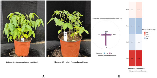 Analysis of phosphorus distribution across soybean plant organs revealed distinct allocation patterns under phosphorus stress conditions (Figure 1A,B). Pods demonstrated the highest phosphorus content among all plant organs, with 22.6% in control treatment and 23.2% in the phosphorus-limited treatment. This preferential allocation to reproductive organs was consistently observed across both experimental conditions, indicating a robust biological response independent of phosphorus availability levels.