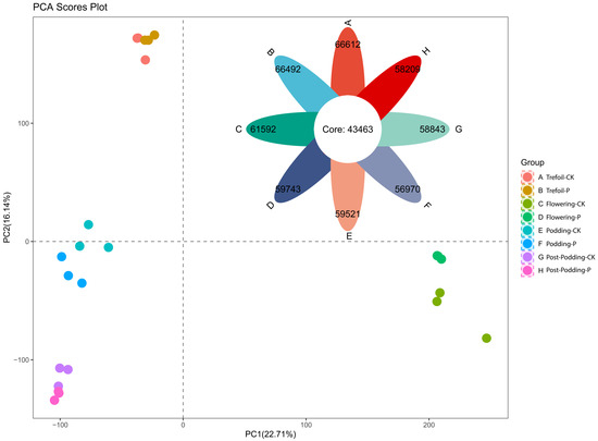 Transcriptomic variation across soybean developmental stages under phosphorus stress. Legend: Trefoil—control (A), Trefoil—treatment (B), Flowering—CK (C), Flowering—P (D), Podding—CK (E), Podding—P (F), Post-podding—CK (G), Post-podding—P (H). CK (control) = phosphorus-deficient (pure vermiculite); P = phosphorus-limited (with Ca10(PO4)(OH)5). Principal component analysis of gene expression profiles from soybean leaf samples across four developmental stages under two phosphorus stress conditions. Each point represents a biological replicate (n = 3 per group), with PC1 and PC2 explaining 22.71% and 16.14% of variance, respectively. Developmental stage drives primary transcriptomic separation along PC1, while phosphorus treatment effects are secondary. Tight clustering within groups demonstrates consistent gene expression patterns, with developmental progression creating greater transcriptomic differences than phosphorus treatment intensity.