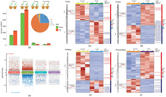 Identification of key genes in response to low-phosphorus stress in four periods. (a) Differentially expressed genes (DEGs) at different stages (Trefoil, Flower, Podding, and Post-podding) between the control and treatment under low-phosphorus stress. (b) Analysis of differential gene expression indicating up- and down-regulated genes across all four comparison groups. A log2FC > 1 and FDR < 0.05 is represented as significantly up-regulated in red, while a log2FC < −1 and FDR < 0.05 is represented as significantly down-regulated in green. A total of 39 key genes were identified at the extremes of the volcano plot with |log2FC| > 11 and FDR < 0.01. (c–f) The expression pattern of the DEGs across the four stages shown by a clustering heatmap: Trefoil (c), Flower (d), Podding (e), and Post-podding (f).
