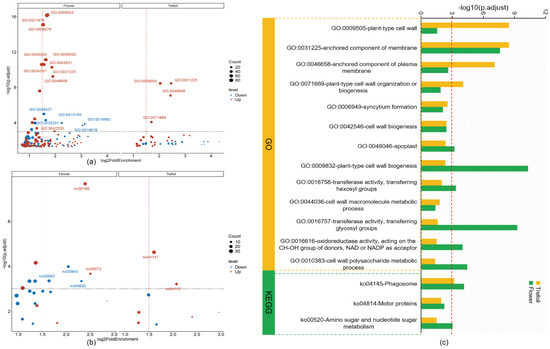 Functional characteristics of DEGs across different periods. (a) GO enrichment analysis of DEGs (up-regulated and down-regulated) during the Trefoil and Flower periods based on the GO database. The log2 (fold enrichment) is plotted on the x-axis, and −log10 (p.adjust) is plotted on the y-axis. The blue bubbles indicate down-regulated DEGs, while the red bubbles indicate up-regulated DEGs; the area of each bubble represents the number of genes enriched in the GO terms. Key terms are marked where p.adjust < 0.001 and log2FoldEnrichment > 1.5. (b) KEGG enrichment analysis of DEGs (up-regulated and down-regulated) during the Trefoil and Flower periods based on the KEGG database. The log2 (fold enrichment) is plotted on the x-axis, and −log10 (p.adjust) is plotted on the y-axis. The blue bubbles represent pathways enriched with down-regulated DEGs, while the red bubbles represent pathways enriched with up-regulated DEGs; again, the bubble area reflects the number of genes enriched in the KEGG pathways. Key pathways are marked where p.adjust < 0.001 and log2FoldEnrichment > 1.5. (c) The GO terms and KEGG pathways were significantly enriched in both the Trefoil and Flower periods. The x-axis shows the terms and pathways enriched in Trefoil (yellow) and Flower (green), represented by −log2 (p.adjust) with a threshold of p = 0.001. A total of 3 pathways and 13 terms were significantly enriched in both the Trefoil and Flower stages with p.adjust < 0.05.