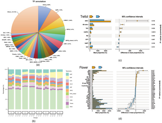 We annotated 73,791 genes using the Plant Transcription Factor Database (PlantTFDB 5.0), identifying 87 transcription factors (TFs) that were differentially expressed under low-phosphorus stress. The representation of these TFs ranged from 0.03% to 8.08% of the total transcription factors. The 31 TF families with representation > 1% accounted for 80.65% of all differentially expressed TFs (Figure 5a), with the top 10 families being bHLH (8.08%), bZIP (7.18%), WRKY (5.94%), MYB (5.41%), MYB_related (4.67%), ERF (4.61%), C2H2 (3.90%), C3H (3.09%), ARF (2.51%), and NAC (2.48%) (Figure 5b). In the Trefoil stage, eight TFs showed significant differential expression, with three up-regulated (Dof, GeBP, and OFP) and five down-regulated (CAMTA, HB-other, RB, SNF2, and TAZ) (Figure 5c). The Flower stage exhibited more dramatic changes, with 31 TFs showing significant differential expression, with 18 up-regulated (including ARID, BES1, bHLH, bZIP, C2H2, and others) and 13 down-regulated (including B3, CAMTA, ERF, NAC, and others) (Figure 5d).