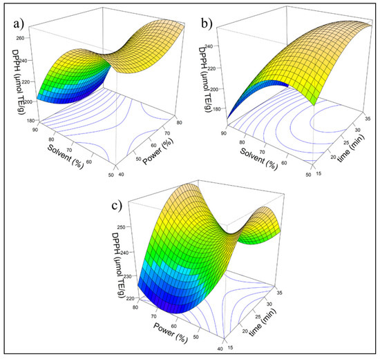 Figure 1. Response surface for antioxidant capacity (DPPH): (a) Effect of solvent (%) and power (%) on DPPH; (b) effect of solvent (%) and time (min) on DPPH; (c) effect of power (%) and time (min) on DPPH. The color gradient, ranging from blue to brown, with blue representing lower DPPH values and brown representing higher values.The response surface model for antioxidant capacity measured by the DPPH assay is described by the following quadratic equation:.