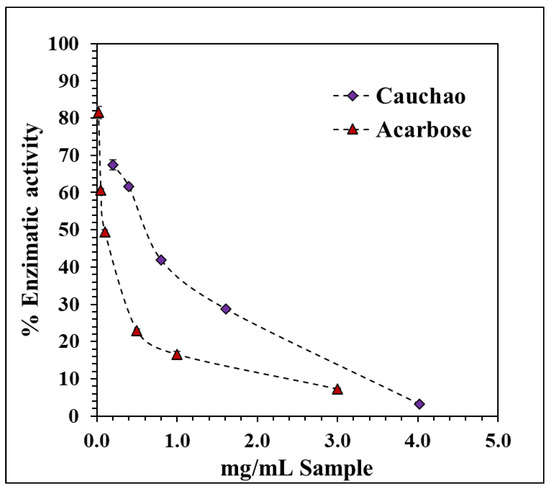 The enzyme α-glucosidase plays a key role in the hydrolysis of complex carbohydrates into simpler, absorbable sugars. Inhibiting its activity is an effective strategy to delay intestinal glucose absorption, thereby reducing postprandial glycemic spikes and potentially slowing the progression of type 2 diabetes mellitus [33]. The Cauchao extract demonstrated a clear, concentration-dependent inhibition of α-glucosidase activity, with a progressive decline in enzymatic function from 67% to nearly 5% at concentrations of 4 mg/mL (Figure 3). The resulting inhibition curve exhibited a decreasing hyperbolic kinetic profile, fitted using a nonlinear exponential model, yielding an IC50 of 0.558 ± 0.015 mg/mL, indicative of high inhibitory potency at relatively low concentrations. This value is competitive with other berry extracts reported in the literature, including mulberry fruit (IC50 = 0.62 ± 0.06 mg/mL) [34], fermented murta berry juice (IC50 = 805 ± 20 µg/mL) [35], and freeze-dried maqui extract (IC50 = 0.315 ± 0.046 mg/mL) [27]. Notably, the strong inhibitory effect of the Cauchao extract was observed despite it being a crude, non-fractionated preparation. Although its potency is significantly lower than that of acarbose (IC50 = 0.057 ± 0.005 mg/mL), a synthetic reference inhibitor.