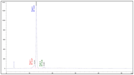 Figure 4. Chromatographic profile of the Cauchao berry extract at 520 nm, where three major peaks were detected at retention times of 12.27, 13.01, and 16.36 min, respectively.