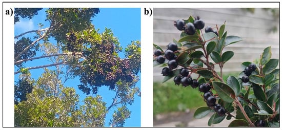 Figure 5. Amomyrtus luma (Cauchao berries). (a) General view of the Amomyrtus luma tree bearing ripe fruits, photographed in its natural environment in southern Chile. (b) Close-up of ripened Cauchao berries on the plant. Author: Marisol Runiahue. Date: February 2025.