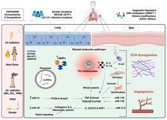 Shared molecular pathways and environmental drivers of skin and lung fibrosis. Environmental and genetic triggers (UV radiation, pollution, viral infection, telomere attrition, and risk alleles such as MUC5B) initiate epithelial or keratinocyte injury and immune activation. These upstream signals converge on profibrotic cytokines (IL-4/IL-13), autoimmune processes, and endothelial damage, which fuel fibroblast activation. Conserved signaling networks that drive chronic remodeling—including TGF-β/SMAD and non-SMAD cascades, Wnt/β-catenin stabilization, and Notch-driven epithelial–mesenchymal crosstalk—drive the transition of fibroblasts to myofibroblasts. Periostin further amplifies this profibrotic milieu by reinforcing ECM crosslinking and feedback to fibroblasts. Downstream, persistent ECM deposition (collagen or fibronectin) increases tissue stiffness and hypoxia, creating a vicious cycle of fibroblast reactivation. While organ-specific remodeling manifests as dermal thickening and immune infiltration in the skin, or alveolar injury and distal airway remodeling in the lung, both share a convergent fibrotic program. Epigenetic regulators—including dysregulated miRNAs (e.g., miR-21 upregulation or miR-29 loss), lncRNAs (HOTAIR, MALAT1, and DNM3OS), DNA methylation (DNMT1), and histone modifications (EZH2 and HDACs) fine-tune these responses. Synergistically, these pathways illustrate how environmental insults, genetic susceptibility, epigenetic regulation, and immune dysregulation coalesce into self-sustaining fibroinflammatory loops that underlie the common biology of skin and lung fibrosis. (↑: upregulation, ↓: downregulation and ⟞: suppression) Created in BioRender. https://BioRender.com/83l0272 (accessed on 18 August 2025).