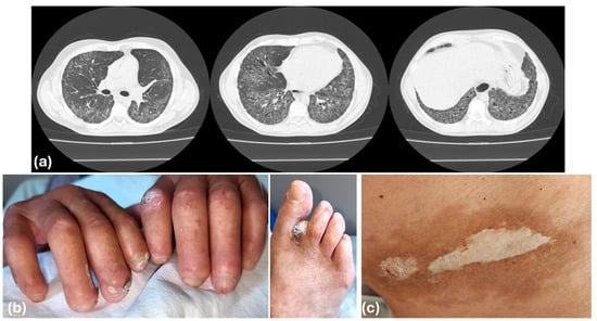 (a) High-resolution computed tomography (HRCT) scan of the chest in a patient with systemic sclerosis-associated interstitial lung disease (SSc-ILD). The scan demonstrates imaging features consistent with a fibrotic non-specific interstitial pneumonia (NSIP) pattern, including bilateral, basal-predominant ground-glass opacities with relative subpleural sparing, reticulation, and traction bronchiectasis. Additionally, a dilated esophagus is visible, a common extrathoracic manifestation of systemic sclerosis. (b) Scleroderma in the fingers, toes, and (c) in the abdominal area with characteristic central fibrosis. (Courtesy of the archive of Prof. Argyris Tzouvelekis and Dr. Katerina Grafanaki).