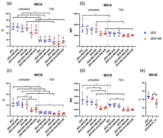 Phenotype of JEG-3 cells under mono- and co-culture conditions. The figure shows the percentage (%) of JEG-3 cells expressing MICA (a) and MICB (c,e) proteins, as well as the intensity of expression (MFI) of MICA (b) and MICB (d). Some cells were treated with TSA (a–d), rMICA/B, and anti-MICA/B. Some NK cells were activated with IL-15 (e). MFI—Median Fluorescence Intensity; untreated—TSA-untreated cells; TSA—TSA-treated cells; JEG—JEG-3 cells; NK—NK-92 cells. Significant differences: *—p < 0.05; **—<0.01. There were four biological replicates with one technical replicate in each experiment. The full version of the figure demonstrating the changes in the JEG-3 cell phenotype is presented in Supplementary Figure S2.