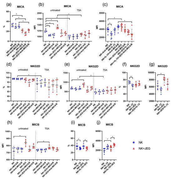 Phenotype of NK-92 cells under mono- and co-culture conditions. The figure shows the percentage (%) of NK-92 cells expressing MICA (a), NKG2D (d,f), and MICB (i) proteins, as well as the intensity of expression (MFI) of MICA (b,c), NKG2D (e,g), and MICB (h,j). Some cells were treated with TSA (b,d,e,h), rMICA/B, and Anti-MICA/B. Some NK cells were activated with IL-12 (f,g) or IL-15 (i,j). MFI—Median Fluorescence Intensity; untreated—TSA-untreated cells; TSA—TSA-treated cells; JEG—JEG-3 cells; NK—NK-92 cells. Significant differences: *—p < 0.05; **—<0.01. There were four biological replicates with one technical replicate in each experiment. The full version of the figure demonstrating the changes in the NK-92 cell phenotype is presented in Supplementary Figure S3.