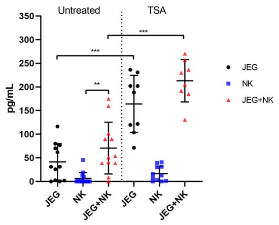 The sMICB concentration (pg/mL) in the medium after the mono- and co-culturing of NK-92 and JEG-3 cells. Untreated—TSA-untreated cells; TSA—TSA-treated cells. Supernatants were obtained from three independent experiments with at least 3 technical replicates. Significant differences: **—p < 0.01; ***—<0.001.