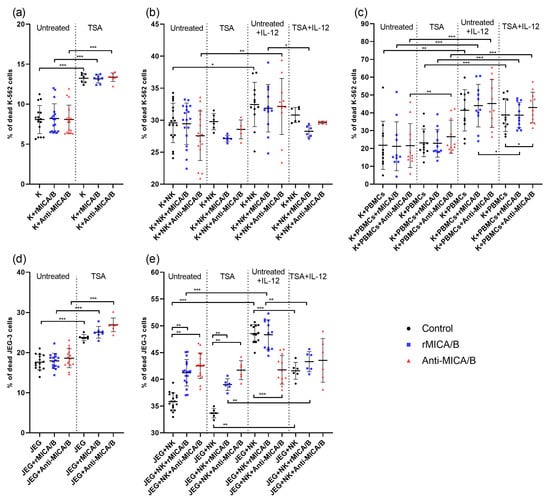 Cytotoxicity of NK-92 cells (a,b,d,e) and PBMCs (c) toward target cells. The percentage of dead K-562 (a) and JEG-3 (d) cells, untreated or pre-incubated with TSA in the presence of rMICA/B or anti-MICA/B. The percentage of dead K-562 (b) and JEG-3 (e) cells after co-culturing with untreated or IL-12-activated NK-92 cells. The percentage of dead K-562 (c) after co-culturing with untreated or IL-12-activated PBMCs. The death level of target cells under monoculture conditions was significantly lower in all cases than after co-culturing with NK cells. For (a,b,d,e), each series included three experiments with at least two technical repetitions. For (c), PBMCs from 12 donors were used. Untreated—TSA-untreated targets; TSA—TSA-treated targets; Untreated + IL-12—TSA-untreated targets with IL-12-activated NK cells or PBMCs; TSA+IL-12—TSA-treated targets with IL-12-activated NK cells or PBMCs; K—K-562 cells; JEG—JEG-3 cells; NK—NK-92 cells; PBMCs—peripheral blood mononuclear cells. Significant differences: *—p < 0.05; **—<0.01; ***—<0.001.