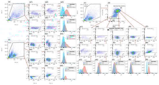 A gating strategy used for the estimation of NK-92 and JEG-3 cells’ phenotype after co-culturing. (a–c)—two-dimensional histograms showing the JEG-3 (a), NK-92 (b), and JEG-3+NK-92 (c) cell distributions in FSC/SSC coordinates. (a1–a6)—histograms showing the MICA (AF-700) (a1–a3) and MICB (AF-750) (a4–a6) expression by JEG-3 cells in monoculture conditions. (b1–b9)—histograms showing the MICA (AF-700) (b1–b3), MICB (AF-750) (b4–b6), and NKG2D (APC) (b7–b9) expression by NK-92 cells in monoculture conditions. (d)—a two-dimensional histogram showing the distribution of NK-92 cells treated with CFSE and anti-CD45 antibodies, as well as JEG-3 cells treated with anti-CD45 antibodies in CFSE (FITC)/CD45 (BV480) coordinates. (e1–e6)—histograms showing the MICA (AF-700) (e1–e3) and MICB (AF-750) (e4–e6) expression by JEG-3 cells after co-culturing with NK-92 cells. (f1–f9)—histograms showing the MICA (AF-700) (f1–f3), MICB (AF-750) (f4–f6), and NKG2D (APC) (f7–f9) expression by NK-92 cells after co-culturing with JEG-3 cells. (a1,b1,e1,f1)—isotype controls for MICA; (a4,b4,e4,f4)—isotype controls for MICB; (b7,f7)—isotype controls for NKG2D; (a2,b2,e2,f2)—anti-MICA antibodies; (a5,b5,e5,f5)—anti-MICB antibodies; (b8,f8)—anti-NKG2D antibodies; (a3,a6,b3,b6,b9,e3,e6,f3,f6,f9)—the difference in the intensity of protein expression following treatment with isotypic controls versus specific antibodies.