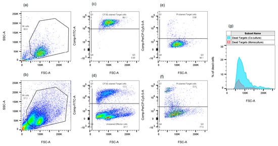 Evaluation of cytotoxic activity of effector cells (NK-92 cells/PBMCs) against target cells (JEG-3/K-562 cells). (a,b)—two-dimensional histograms showing the distribution of K-562 target cells under monoculture (a) and co-culture conditions with NK-92 cells (b) in FSC/SSC coordinates. (c,d)—two-dimensional histograms showing the distribution of CFSE-treated K-562 cells under monoculture (c) and co-culture conditions with untreated NK-92 cells (d) in CFSE (FITC)/FSC coordinates. (e,f)—two-dimensional histograms showing the distribution of CFSE-treated K-562 cells stained with propidium iodide (PI) under monoculture (e) and co-culture conditions with NK-92 cells (f) in PI (PerCP-Cy5-5)/FSC coordinates. (g)—a histogram showing the difference in the number of dead K-562 cells under monoculture versus co-culture conditions with NK-92 cells.