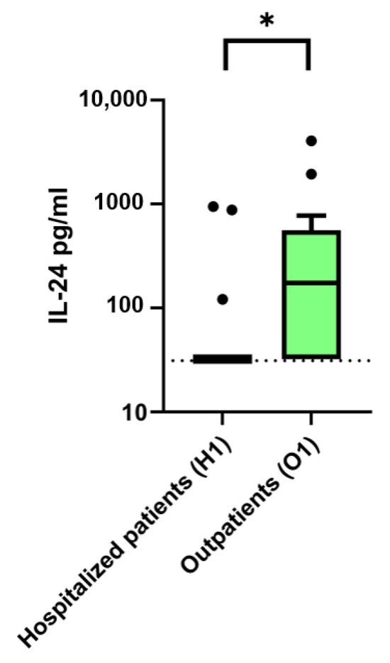 IL-24 serum levels (pg/mL) in COVID-19 patients according to disease severity. Hospitalized patients with critical, severe, and moderate disease courses at the time of hospital admission or inpatient transfer (H1) are compared to outpatients after mild disease course during convalescence (O1). For IL-24 values below the lower limit of quantification (LLOQ, 62.5 pg/mL), values were set to half the LLOQ (31.25 pg/mL), shown as a dashed line. Values are presented as Tukey boxplots, where the box represents the interquartile range (IQR), the horizontal line indicates the median, whiskers extend to 1.5 × IQR, and outliers are shown as individual points. The y-axis is displayed on a logarithmic scale (log10). IL-24, Interleukin 24. Continuous variables were compared using the Mann–Whitney U test (Wilcoxon test), * p < 0.05.