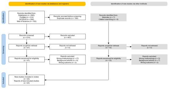 Among 682 search results, 182 duplicates were removed and 514 were kept. After abstract and full-text screening, 20 studies investigating ZnO-based nanoparticles for cancer therapy were included [,,,,,,,,,,,,,,,,,,,]. Eligible studies were published between 2016 and 2024, using formulations that shared core components based on ZnO nanostructures and were functionalized for drug delivery, tumor targeting, or physicochemical modulation. A PRISMA flow diagram is shown in Figure 1, while Table 1 summarizes all included studies.