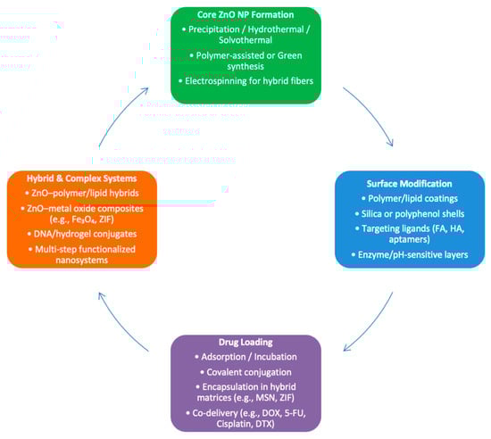 Nanoparticle synthesis methods varied in complexity, from simple physical adsorption strategies like the incubation of ZnO nanoparticles with DOX under stirring, followed by centrifugation and freeze-drying [,] to co-precipitation or hydrothermal synthesis for ZnO core formation, followed by drug loading and surface modification [,]. More elaborate constructions incorporated layer-by-layer functionalization, such as the sequential modification in ZnO-DOX/R8@HA involving 3-aminopropyltriethoxysilane (APTES)-mediated amination, thioketal crosslinking, and hyaluronic acid shell coating []. Similarly, the 5-FU@ZIF-90@ZnO nanocomposite was prepared by encapsulating 5-FU into ZIF-90, followed by ZnO shell coating via triethanolamine-mediated precipitation [].