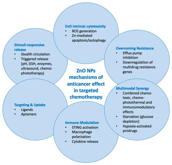 Summary of anticancer action mechanisms of ZnO nanoparticles for achieving targeted chemotherapy.