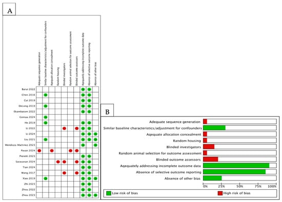Risk of bias and applicability concerns with the use of the SYRCLE risk of bias tool for the quality assessment of animal studies. (A) Authors’ judgements regarding specific domains in eligible studies. Green and red indicate “low” and “high” risk of bias, respectively, while blank cells represent “unclear” risk of bias. (B) Overall summary of applicability concerns, with each domain shown as a percentage across included studies. The blank part in each bar represents an “unclear” applicability concern.