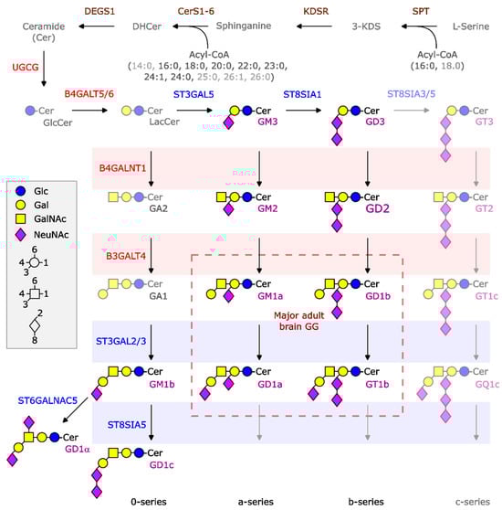 Symbolic structures and biosynthesis of ganglio-series gangliosides (GGs). GGs are synthesized by the stepwise addition of monosaccharides to ceramide (Cer) via the action of different glycosyltransferases (in red) and different sialyltransferases (in blue). Cer is produced in the endoplasmic reticulum by the sequential action of serine palmitolyltransferase complex (SPT), ketodihydrosphingosine reductase (KDSR), one of six ceramide synthases (CerS1-6), and dihydroceramide desaturase 1 (delta 4-desaturase, sphingolipid 1, DEGS1). Transported to the Golgi apparatus, UDP-glucose ceramide glucosyltransferase (UGCG) will convert Cer to GlcCer at the cytosolic leaflet. On the luminal side of the Golgi apparatus, glycosyltransferases and sialyltransferases then can convert GlcCer in a stepwise manner to lactosylceramide (LacCer) and more complex glycosphingolipids (GSLs) and gangliosides. Lac-Cer is substrate for six transferases enabling the production not only of ganglio-series GSLs (as presented), but also of (neo)lacto-, globo-, isoglobo-series and complex sulfatides (not shown here). Gangliosides of the ganglio-series are divided into four series. The “0-series” includes GM1b, GD1alpha, and GD1c. The “a-series” includes GM3, GM2, GM1a, and GD1a. GD3, GD2, GD1b, and GT1b belong to the “b-series” and GT3, GT2, GT1c, and GQ1c belong to the “c-series”. The arrows indicates that the synthesis can continue towards more complex structures. In normal brains, basically, a- and b-series GGs are expressed. The length of the amide-bound acyl chain (see indication in brackets) depends on the specificity of the expressed ceramide synthases (CerS1-6) and is dominated by CerS1 and the presence of a stearic acid residue in normal brain neurons []. Glc: glucose, Gal: galactose, GalNAc: N-acetyl galactosamine, NeuNAc: N-acetyl neuraminic acid, 3-KDS: 3-ketodihydrosphingosine, DHCer: dihydro-ceramide, B(3/4)GALT4/5/6: beta-1-(3/4)-galactosyltransferase 4/5/6, B4GALNT1: beta-1-4-N-acetyl galactosaminyltransferase 1, ST3GAL2/3/5: ST3 beta-galactoside alpha-2,3-sialyltransferase 2/3/5, ST6GALNAC5: ST6 N-acetyl-galactosaminide alpha-2,6-sialyltransferase 5, ST8SIA1/3/5: ST8 alpha-N-acetyl-neuraminide alpha-2,8-sialyltransferase 1/3/5.
