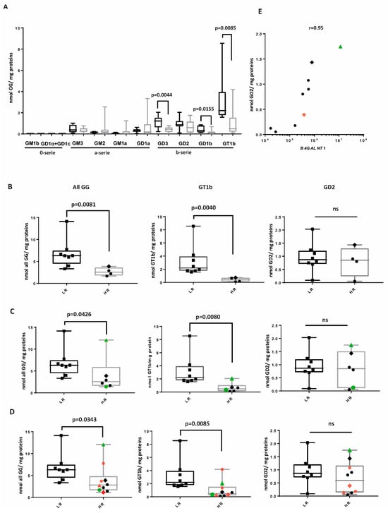 The b-series of GGs is associated with low-risk NBL. The GG composition of eight low-risk (LR) (black box plots) and ten high-risk (HR) samples (gray box plots) was analyzed by mass spectrometry in all samples (A), only in samples at diagnosis (B), or after inclusion of samples (in green) retrieved after chemotherapy (C) and samples (in red) retrieved after anti-GD2 therapy (D). The difference in the expression levels of all GGs, GT1b, and GD2 was assessed using a Mann–Whitney test. The relationship between the amount of GD2 in nine HR samples and the expression of B4GALNT1 is shown in (E) and was analyzed using Spearman correlation (monotonic relationship). The samples indicated with a triangle or with a diamond, respectively, in (C), (D), and (E) belong to the same HR patients.