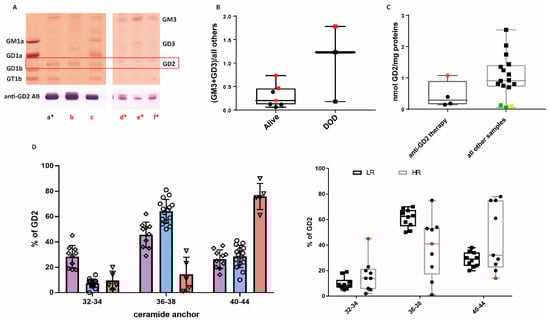 HR patients had very heterogeneous GG profiles. While LR NBL expressed particularly complex GGs, particularly of the b-series, within HR samples, we observed the following profiles (Table 2): (A) similar profile as in LR, characterized by the dominance of GT1b (Figure 3A, lane a); (B) almost only GD2 is expressed (Figure 3A, lane b); (C) only GM3 or GD3 is expressed (Figure 3A, lanes d to f); (D) complex GGs of the a- and b-series are both expressed, with a particularly strong expression of GD1a (Figure 3A, lane c); and (E) GD1a and GM2 (both a-series) are the prevalent species expressed (Supplemental Table S2, sample #18). In our small cohort of HR samples, MYCN amplification was not associated with a particular GG profile (Supplemental Table S3). In our cohort of high-risk patients, three died of the disease. Only one of them was MYCN-amplified. Two of the patients had tumors characterized by the stopping of synthesis beyond GM3 or GD3 (profile C), with very low GD2 expression, irrespective of the MYCN status (Figure 3B). For the patient with MYCN amplification, samples collected at different time points were available. Interestingly, this profile did not change at different time points of the therapy (Figure 3A, lanes d to f). One HR patient who died of the disease (not MYCN-amplified) had a profile similar to a LR NBL (Figure 3A, lane a). GD2 expression was high in this sample, even though the patient received anti-GD2 mAb, while GD2 expression was rather low in the other samples retrieved after anti-GD2 therapy, suggesting an intrinsic resistance to anti-GD2 mAb therapy (Figure 3C, red point). The composition of the ceramide anchor of GD2 in this sample was different from the one detected in LR NBL. We were indeed able to identify GD2 isoforms with different lengths of the ceramide anchor across the NBL samples. Considering the ceramide anchors of children contain predominantly C18-sphingosine (with a minor contribution of C20-sphingosine), we identified ceramide anchors containing C18 and C20 fatty acid chains (ceramide anchor length of 36–38), typical of normal neurons; shorter anchors containing saturated C14 and C16 (ceramide anchor length of 32–34); and very long ceramide anchors with C22–C26 fatty acids (ceramide anchor length of 40–44). Each sample contained a mixture of GD2 with different lengths of anchor. Some samples expressed a relatively high (about 30%) portion of shorter and very long ceramides (Table 1 group “short”), some samples expressed preferentially normal neuronal ceramides (C36-38) (Table 1 group “normal”), and some samples almost exclusively contained very long ceramides (Table 1 group “long”) (Figure 3D, left panel). When the samples were divided according to the risk, LR samples had a dominance of ceramide anchor length of 36–38 (Figure 3D, right panel). The sample with profile A and high GD2 expression after anti-GD2 mAb treatment was characterized by a high proportion of smaller ceramide anchors (32-34) (Figure 3D, red point in the right panel). Very long ceramide anchors with C22–C26 fatty acids (ceramide anchor length of 40–44) were less abundant in LR samples, and interestingly, all samples with mostly very long ceramide anchors were HR samples only. MYCN amplification was not associated with a particular length of the ceramide anchor (Supplemental Table S4), but, again, the limited sample size reduces the statistical power to detect associations.