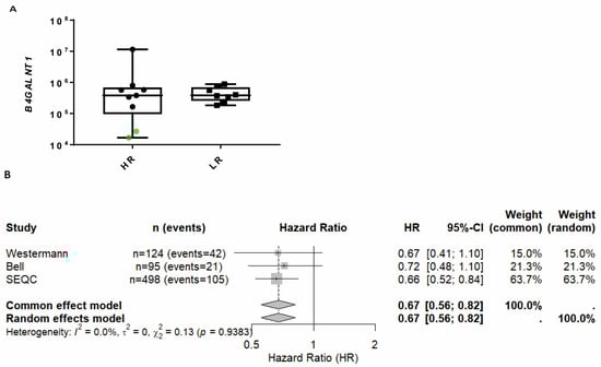 HR and LR samples were compared using the Mann–Whitney test. The relationship between two variables was analyzed by Spearman correlation. Survival analysis based on B4GALNT1 gene expression was conducted using Cox proportional hazards regression via the R2: Genomics Analysis and Visualization Platform (https://r2.amc.nl) across multiple neuroblastoma (NBL) datasets (see Supplementary Table S5), accessed on 5 June 2025. Overall survival data were used as the endpoint. The derived p-values from the R2 Cox hazard regression, where B4GALNT1 expression was used as a continuous coefficient, were further used for a pooled meta-analysis to estimate the common and random effects of three RNA-seq studies (EGAD00001006625 (Westermann) [], and GSE181582 (Bell) [] and GSE62564 (SEQC) [] via the R package meta (version 8.1-0) []. We restricted EGAD00001006625 to diagnostic (“initial”) tumors for the primary meta-analysis to avoid bias from post-treatment/relapse sampling. Treatment status at sampling was not available for the other two studies.