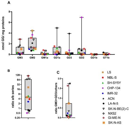 Neuroblastoma cell lines preferentially express the a-series of gangliosides. GGs of the a- and of the b-series were quantified by mass spectrometry in eleven cell lines. Each cell line is indicated by a symbol; the distribution of the respective values is shown as box and whisker plots. (A) Concentration of the indicated GGs (X-axis) across the cell lines. The amount of each GG is indicated as nmol GG per mg of total protein (Y-axis). (B) The ratio between the sum of GGs of the a-series (GM3, GM2, GM1a, GD1a) and the sum of GGs of the b-series (GD3, GD2, GD1b, GT1b) was calculated for each cell line (Y-axis: ratio a/b-series). (C) The ratio between the sum of GM3 and GD3 and the sum of all other GGs was calculated for each cell line (Y-axis: ratio (GM3+GD3)/others).