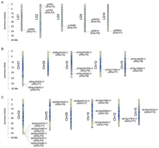 Chromosomal localization and distribution of NLPs in I. batatas (A), I. trifida (B), and I. triloba (C). The bars in the left margin represent chromosomes. The chromosome numbers are displayed on the left side of the chromosomes, and the gene names are displayed on the right side. Detailed chromosomal location information is listed in Table S1.