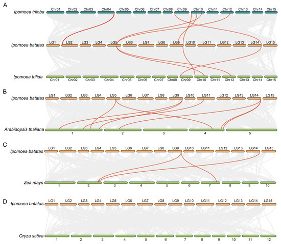 Syntenic NLP gene pairs between I. batatas, I. trifida, and I. triloba in (A), I. batatas and Arabidopsis in (B), I. batatas and Zea mays in (C), and I. batatas and Oryza sativa in (D). Gray lines indicate all the collinear blocks in the genome, and the red lines indicate the syntenic NLP gene pairs.