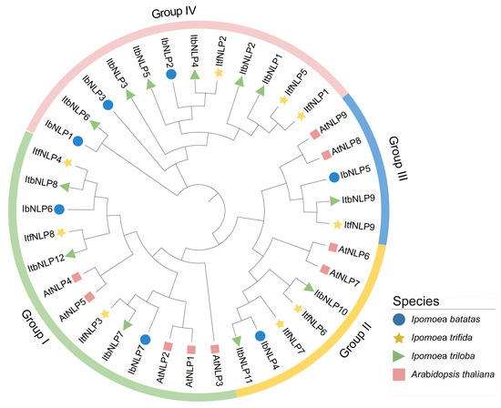 Phylogenetic analysis of the NLPs in I. batatas, I. trifida, I. triloba, and Arabidopsis. A total of 37 NLPs were divided into our subgroups (Groups I to IV) according to the evolutionary distance. The blue circles, yellow pentagrams, green triangles, and pink squares represent IbNLPs in I. batatas, ItfNLPs in I. trifida, ItbNLPs in I. triloba, and AtNLPs in Arabidopsis, respectively.