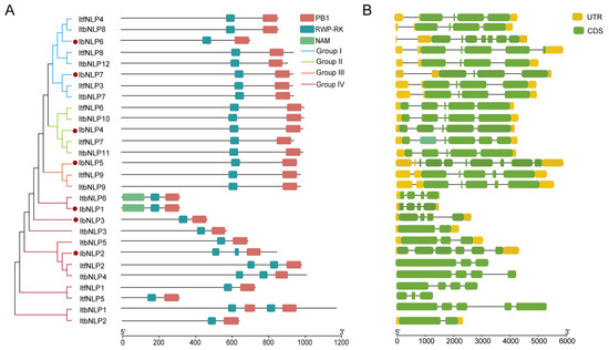 The phylogenetic tree shows that NLPs are distributed into four groups on the left. The red dots represent the IbNLPs. (A) Conserved domain structure of NLPs in I. batatas, I. trifida, and I. triloba. The pink, blue, and yellow boxes represent the PB1 domain, RWP-RK domain, and NAM domain, respectively; and (B) Exon–intron structure of NLPs in I. batatas, I. trifida, and I. triloba. The yellow boxes, green boxes, and grey lines represent the UTR, exons, and introns, respectively.