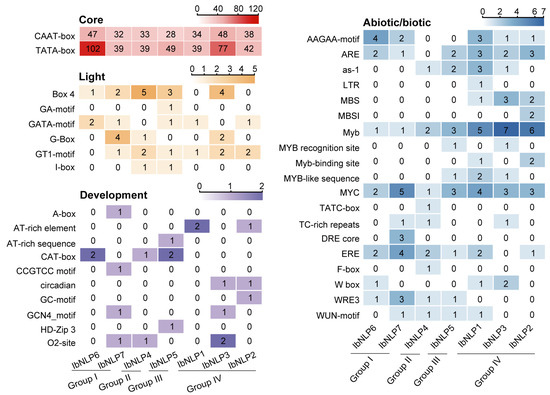 NLPs are involved in light, development, and abiotic/biotic response, and cis-elements in the promoter region play a key role in the expression of NLPs. We analyzed the 2000 bp upstream promoter sequences of NLPs from I. batatas to predict gene function. We divided the elements into four categories: core, light-responsive elements, development regulation, and abiotic/biotic stress-responsive (Figure 5). A large number of core elements were identified in the 7 IbNLPs (CAAT-box and TATA-box) (Figure 5). Most of the IbNLPs contained light-responsive elements such as the GT1 motif, which is believed to affect the growth and development of plants (found in IbNLP1, IbNLP2, IbNLP3, IbNLP4, IbNLP5, and IbNLP7). All IbNLPs contained many development elements, such as the AT-rich element, which plays a key role in the structure and function of the eukaryotic genome (found in IbNLP1 and IbNLP2), CAT-box, which is involved in meristem formation (found in IbNLP4, IbNLP5, and IbNLP6), and the circadian element, which is the core regulator of the circadian clock (found in IbNLP2 and IbNLP3).