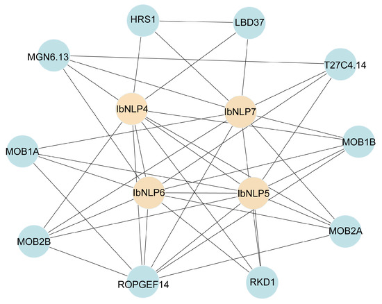 To explore the potential regulatory network of IbNLPs, we constructed an IbNLPs interaction network based on Arabidopsis orthologous proteins (Figure 6). Protein interaction predictions indicated that some IbNLPs (IbNLP4, IbNLP5, IbNLP6, and IbNLP7) could interact with each other to form a heterodimer. In addition, NLPs could interact with the transcription factor HRS1, which can integrate nitrate and phosphate starvation responses and adaptation of root architecture depending on nutrient availability [34]. NLPs could interact with MOB1A/B, which play critical roles in plant development [35,36]. NLPs could interact with ROPGEF14, which is involved in the response to complex environmental signals [37]. These results indicated that IbNLPs were involved in the regulation of nitrate signaling response, plant growth and development, and stress adaptation in sweet potato.