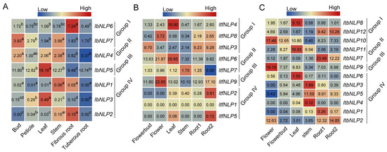 In addition, we used RNA-seq data of six tissues (i.e., flower bud, flower, leaf, stem, root1, and root2) to study the expression patterns of NLPs in I. trifida and I. triloba [33] (Figure 7B,C). In I. trifida, ItfNLP9 in Group III was highly expressed in six tissues. ItfNLP3 was highly expressed in the flower bud, root1, and root2. ItfNLP6 was highly expressed in the flower and leaf (Figure 7B). ItfNLPs in Group IV were lowly expressed in all tissues. In I. triloba, ItbNLP10 and ItbNLP11 were highly expressed in the flower bud and leaf; ItbNLP2, ItbNLP9, and ItbNLP10 were highly expressed in the flower; ItbNLP5 and ItbNLP11 were highly expressed in the stem (Figure 7C). Therefore, we observed that ItbNLP2, ItbNLP7, and ItbNLP12 were highly expressed in the root1 and root2, which suggested that they may regulate root development by regulating nutrient uptake (Figure 7C). Those results showed that NLPs exhibit different expression patterns and play important roles in the growth and development of sweet potato and the two diploids.