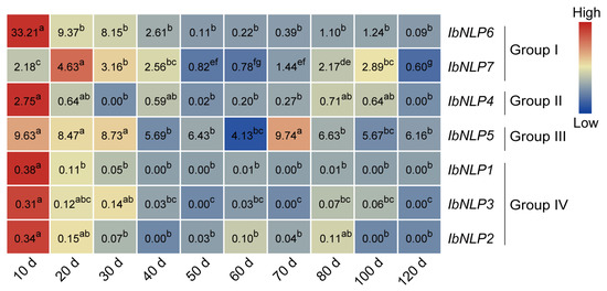 Gene expression patterns of IbNLPs in different root development stages (i.e., 10 d, 20 d, 30 d, 40 d, 50 d, 60 d, 70 d, 80 d, 100 d, and 120 d). The values were determined by RT-qPCR from three biological replicates consisting of pools of three plants, and the results were analyzed using the comparative CT method. The expression of IbNLP6 at 80 d was considered as “1”. The fold changes were shown in the boxes. Different lowercase letters indicate a significant difference for each IbNLP at p < 0.05 based on Student’s t-test.