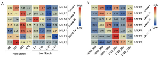 As a root crop, the most important product of the sweet potato is starch. We analyzed the expression of IbNLPs using two published starch-related transcriptomes (Figure 9) [38,39]. The expression level of IbNLP2, IbNLP5, and IbNLP7 in the four high-starch accessions (H8, H21, H42, H74) was higher than that in the four low-starch accessions (L4, L18, L118, L123) (Figure 9A). Moreover, the expression of IbNLP5 in high-starch cultivar H283 was higher than in low-starch cultivar L423 at three different root development stages in tuberous roots (Figure 9B). Notably, all NLPs showed high expression levels in high starch, except IbNLP4 and IbNLP3 (Figure 9A). However, in Group IV, all NLPs were highly expressed at 60 d in L423, which was a low-starch accession (Figure 9B). Those results showed that NLPs exhibit different expression patterns, and IbNLP5 may play an important role in starch synthesis in sweet potato.