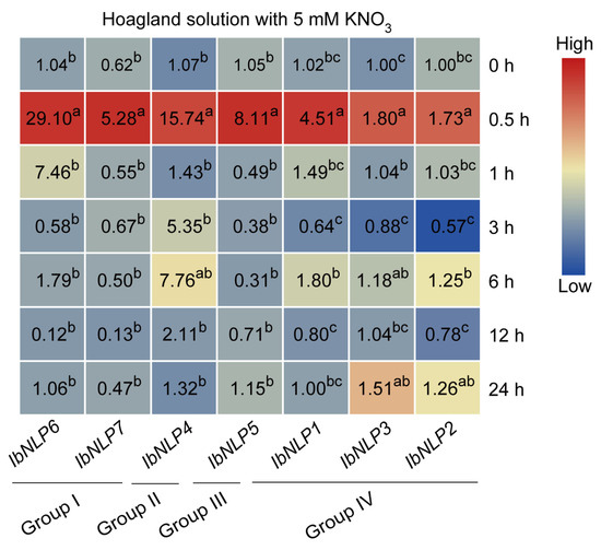 Gene expression of IbNLPs after N starvation treatment. Log2 (FPKM) was shown in the boxes. The values were determined by RT-qPCR from three biological replicates consisting of pools of three plants, and the results were analyzed using the comparative CT method. The expression of IbNLP6 at 0 h was considered as “1”. The fold changes were shown in the boxes. Different lowercase letters indicate a significant difference for each IbNLP at p < 0.05 based on Student’s t-test.