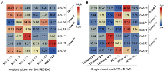 Gene expression of IbNLPs under drought and salt stresses as determined by RNA-seq. (A) Expression analysis of IbNLPs under PEG treatment in a drought-tolerant variety Xu55-2. (B) Expression analysis of IbNLPs under NaCl treatment in a salt-sensitive variety, Lizixiang, and a salt-tolerant line, ND98. Log2 (FPKM) was shown in the boxes.