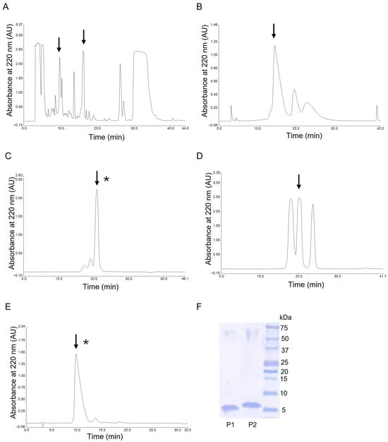 - Cytryńska, M.; Mak, P.; Zdybicka-Barabas, A.; Suder, P.; Jakubowicz, T. Purification and characterization of eight peptides from Galleria mellonella immune hemolymph. Peptides 2007, 28, 533–546. [Google Scholar] [CrossRef]