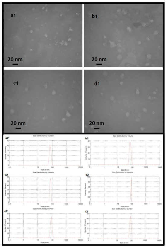 Upper: Nanoparticles imaged using the transmission electron microscopy method. The dimensions of the nanoparticles shown in the image indicate a range of approximately 16 to 20 nanometers for the central core of the nanoparticle. Exosomal particles (a1) coated with nanolipid (b1), exosomal particles containing mRNA (c1) and exosomal particles containing mRNA and coated with nanolipid (d1). Lower: The hydrodynamic size of exosomal particles (a2) coated with nanolipid (b2), exosomal particles containing mRNA (c2) and exosomal particles containing mRNA coated with nanolipid (d2), exosomal particles containing mRNA plus siRNA (e2), and exosomal particles containing mRNA plus siRNA coated with nanolipid (f2). The uniform dimensions and remarkable homology of each nanoparticle are clearly evident.