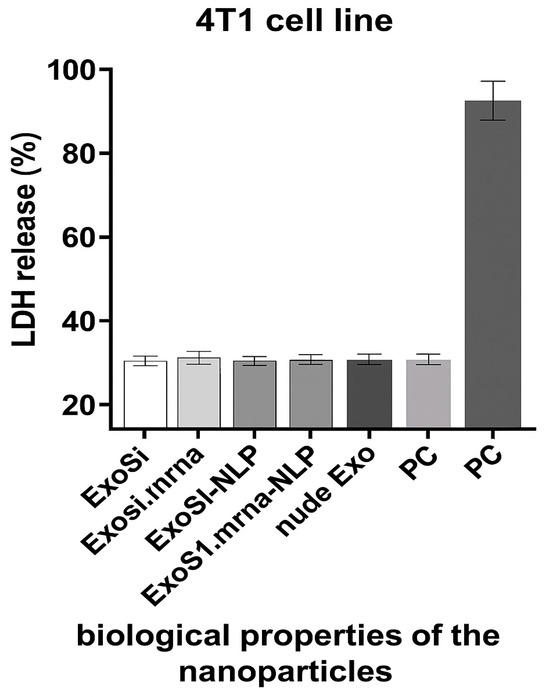 The cytocompatibility of the nanoparticle formulations was evaluated using a lactate dehydrogenase (LDH) cytotoxicity assay (LDH Cytotoxicity Detection Kit, Roche Diagnostics) according to the manufacturer’s instructions. Mouse 4T1 breast cancer cells were seeded in 96-well plates at a density of 1 × 104 cells/well and incubated overnight at 37 °C in a humidified atmosphere containing 5% CO2. The cells were then treated with the nanoparticle formulations or the controls for 24 h. The negative control (NC) consisted of untreated cells incubated in standard culture medium, while the positive control (PC) group was treated with 1% Triton X-100 to induce maximum LDH release. After the incubation period, the culture supernatant was collected and transferred to a new 96-well plate. LDH activity was quantified by measuring absorbance at 490 nm using a microplate reader. All treatments were performed in triplicate, and results were expressed as a percentage of total LDH release (Figure 2).