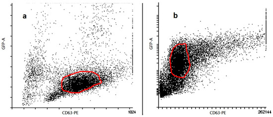 Exosomes were incubated with 5000 antibody-coated beads in 250 μL PBS containing 2% casein for 10 h in a 10 mL tube without agitation at room temperature. After the binding step, the beads were stained with PE-conjugated anti-CD63 (clone TEA3/18 Im-munostep, S.L., Salamanca, Spain). After antibody binding, the beads were washed with filtered PBS containing 2% BSA and were stained with a Magnetic Rack (Magne Sphere(R) Mag. Sep. Stand 12-hole, 12 × 75 mm (Promega, Fitchburg, WI, USA, Ref Z5343). Streptavidin-PE (Immunostep, S.L., Salamanca, Spain) was then incubated, and the beads were subsequently washed with PBS-2% BSA. Samples were analyzed using FACSCalibur flow cytometers (Becton Dickin-son, Franklin Lakes, NJ, USA), and data were analyzed using Kaluza (Beckman Coulter, Singapore).