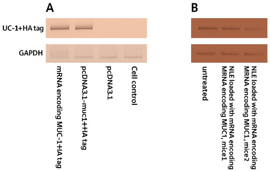 Expression of HA-tagged MUC1 fusion protein in 4T1 cells and lymph nodes of immunized mice. (A) Western blot analysis of MUC1-HA protein expression in 4T1 murine breast cancer cells 48 h after transfection with either mRNA encoding MUC1 + HA tag or plasmid pcDNA3.1-muc1 + HA. GAPDH was used as a loading control. (B) Western blot analysis of lymph node samples collected from immunized BALB/c mice (n = 3 per group) 48 h after subcutaneous injection of neutral lipid emulsions (NLE) loaded with mRNA encoding MUC1 + HA tag. Untreated lymph node samples served as negative controls. Representative bands from each animal are shown. Densitometric quantification and statistical comparison were not performed for these samples.