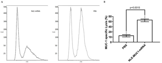 To assess the antigen-specific cytotoxic activity induced by the NLE-based mRNA vaccine, an in vivo CTL assay was conducted (Figure 5). Splenocytes obtained from naïve mice were pulsed with 4T1 cell lysates transfected with MUC1 mRNA and labeled with a high concentration (5 µM) of CFSE (CFSEhigh cells). As a control population, splenocytes pulsed with non-transfected lysate were labeled with a lower concentration of CFSE (0.5 µM) (CFSElow cells). These concentrations were selected based on the commonly used ranges that have been shown to preserve cell viability and function, as confirmed by preliminary titration assays [36]. An equal number of CFSEhigh and CFSElow cells were mixed and intravenously injected into immunized recipient mice on day 10 post-vaccination. As shown in Figure 6, a significant reduction in CFSEhigh cells was observed in mice immunized with the NLE-based mRNA vaccine compared to PBS-treated controls, confirming the induction of robust antigen-specific CTL responses.