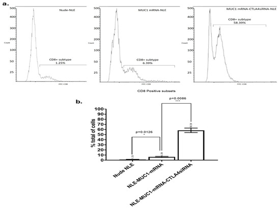 Flow cytometric analysis of tumor-infiltrating CD8+ T cells. (a) Tumor tissues were harvested on day 30 post-treatment and enzymatically dissociated into single-cell suspensions for flow cytometry. CD8+ T cell populations were identified using FITC-conjugated anti-CD8 antibodies. The percentage of CD8+ T cells among total tumor-infiltrating cells is shown for each treatment group: (b) Nude-NLE, NLE-MUC1 mRNA, and NLE-MUC1 mRNA + CTLA-4 siRNA (n = 3 mice per group). Data are presented as mean ± standard deviation (SD). Statistical comparisons were performed using one-way ANOVA followed by Tukey’s post hoc test. * p < 0.05, *** p < 0.01.