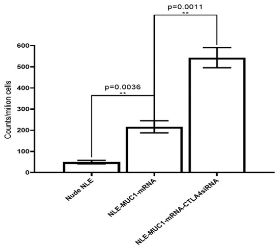 In this study, NLE was used as a carrier and adjuvant system for the development of an mRNA vaccine encoding the tumor-associated antigen MUC1. In addition, the vaccine was combined with CTLA-4 siRNA containing NLE to enhance the vaccine’s immune response against TNBC by improving T cell function. In vivo studies showed that the NP-based mRNA vaccine modified with a mannose targeting the DC surface receptor could efflux into the lymph node and that the encapsulated mRNA could be successfully expressed in the DCs of the lymph node. Furthermore, in vivo studies showed that the NP vaccine could elicit a strong, antigen-specific CTL response against 4T1 TNBC cells and that combined treatment with a CTLA-4-siRNA-containing NLE could significantly enhance the anti-tumor immune response compared to the vaccine or CTLA-4-siRNA alone. This synergistic effect supports the growing evidence that co-administration of tumor antigens and immune checkpoint inhibitors can turn ‘cold’ tumors into ‘hot’ tumors by enabling robust T cell infiltration and activation [41,42]. Our siRNA-based checkpoint inhibition strategy may offer advantages over monoclonal antibodies in terms of reduced systemic toxicity and improved intracellular silencing efficiency. Our siRNA-based checkpoint inhibition strategy may offer advantages over monoclonal antibodies in terms of reduced systemic toxicity and improved intracellular silencing efficiency. Our results are consistent with those of Lin et al. [35], who demonstrated that co-delivery of MUC1 mRNA and CTLA-4 blockade can activate antigen-presenting cells and suppress tumor progression in a triple-negative breast cancer (TNBC) model. However, our study advances this strategy by utilizing a novel nanolipid–exosome hybrid (NLE) platform for the co-delivery of MUC1 mRNA and CTLA-4 siRNA. This bioinspired system offers improved biocompatibility, efficient DC-targeting, and enhanced endosomal escape. As a result, we observed stronger activation of CD8+ T cells and a more immunostimulatory tumor microenvironment, including elevated IFN-γ secretion and increased infiltration of tumor-infiltrating lymphocytes. These findings suggest that the use of exosome-based nanocarriers may provide superior therapeutic efficacy compared to conventional liposomal systems. Although our study did not include an irrelevant antigen or scrambled siRNA control group, several experimental results argue against nonspecific immune activation. In particular, the immune response (CD8+ T cell infiltration, CTL activity, IFN-γ production) was significantly increased only in the groups receiving both MUC1 mRNA and CTLA-4 siRNA and not in the groups treated with PBS, empty NLE, or mRNA alone. In addition, ELISPOT analysis showed that IFN-γ secretion was induced exclusively when stimulated with MUC1-transfected lysates and not with lysates from irrelevant cell lines, emphasizing antigen specificity. Overall, these results indicate that the observed immune activation is primarily due to the specific immunogenic content of the vaccine and not to non-specific effects of the carrier.