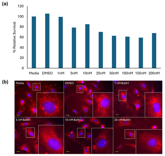 In parallel, cells were seeded for imaging analysis as described in Section 4.4, and acidic vesicles were labelled as described in Section 4.6 with LysoTracker Red following 24 h exposure to 1–25 nM BafA1. Cells treated with 0.02% DMSO served as a solvent control.